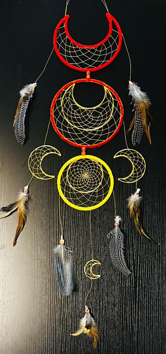 Combo de 3 cercles et de 5 lunes, laine rouge et jaune touché velours, fil doré, 170 nœuds, 11 perles en bois à motifs, 11 petites plumes, 4 plumes noires moucheté blanche et 4 plumes effilées noires et fauves.